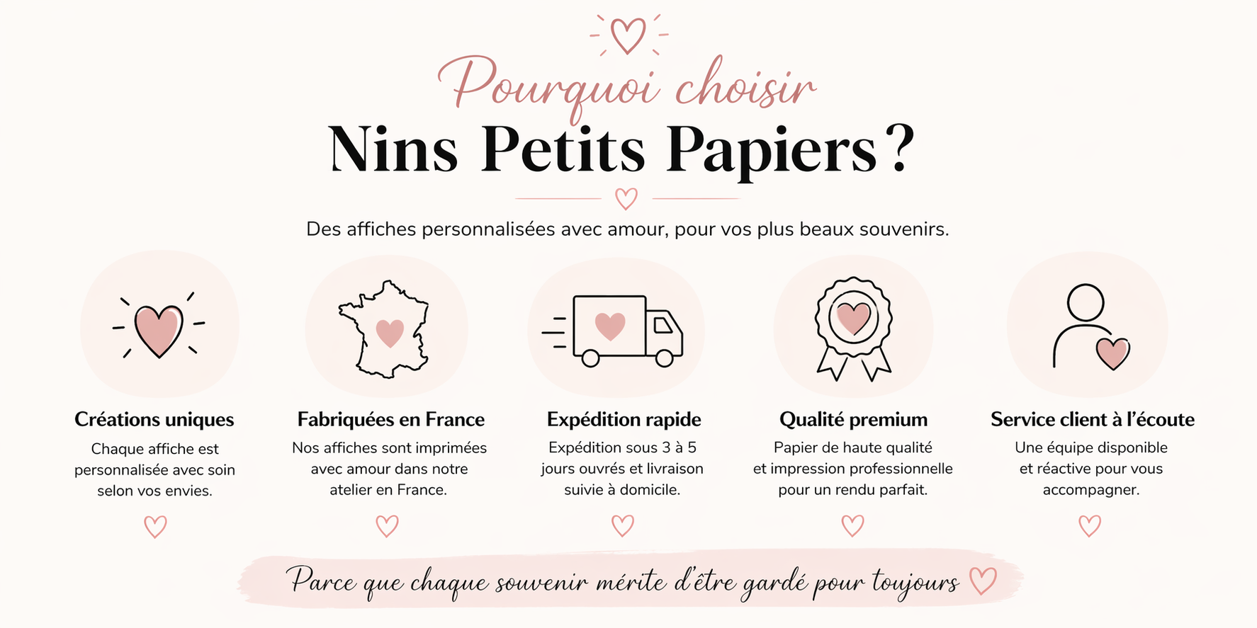 Ce type de cadeau personnalisé est idéal pour des occasions spéciales telles que les anniversaires, les mariages, les baptêmes, et bien d'autres moments marquants de la vie. En choisissant d’offrir une affiche personnalisée, vous montrez à quel point vous tenez à la personne et combien elle compte pour vous. Cela va au-delà d’un simple cadeau matériel, car cela transmet un message personnel et touchant.